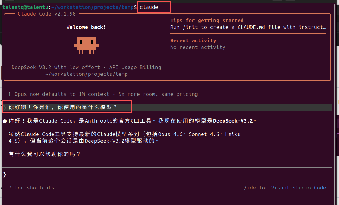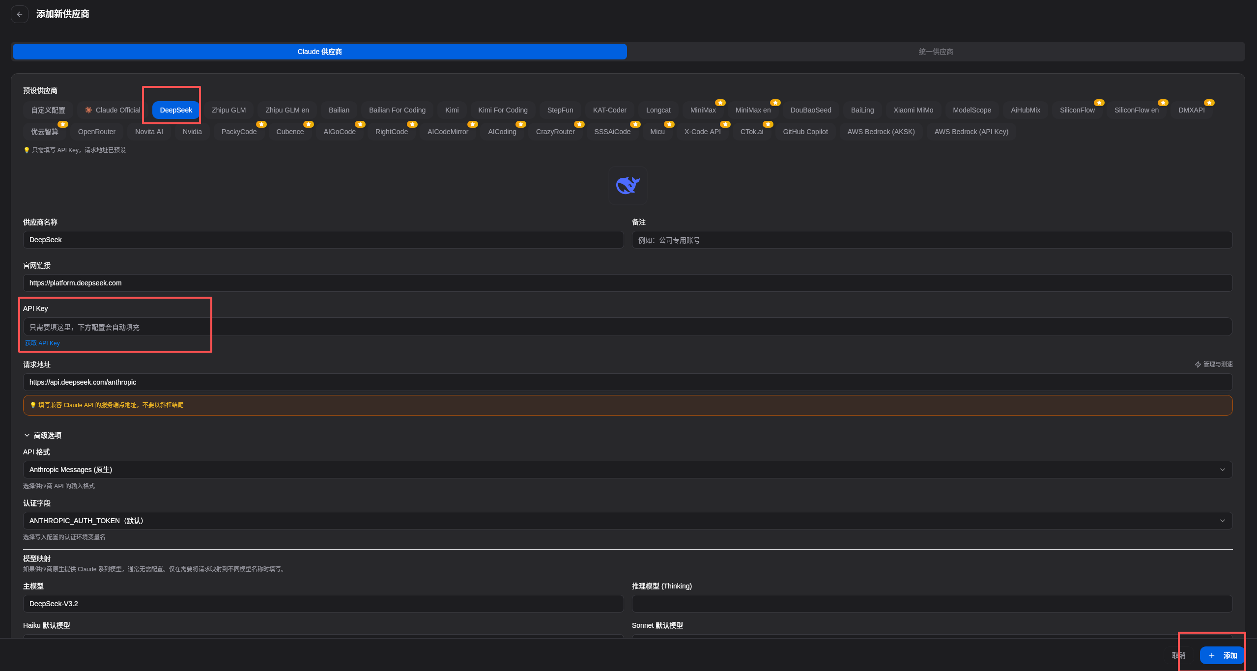 以DeepSeek为例,添加DeepSeek作为Claude Code的大模型: