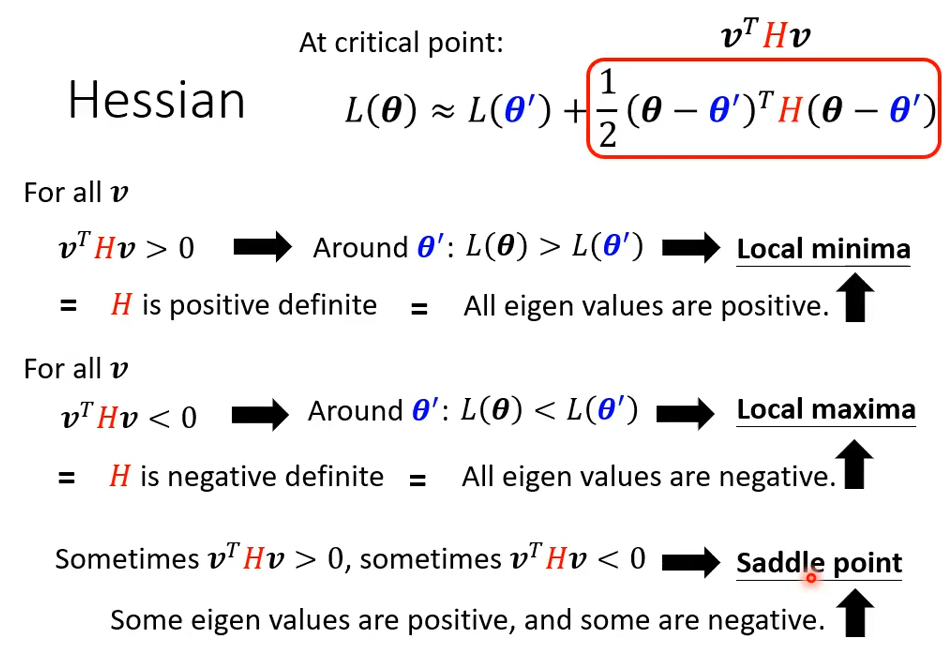 如果遇到 saddle point,我们可以通过Hessian \boldsymbol H判断模型参数更新的方向: