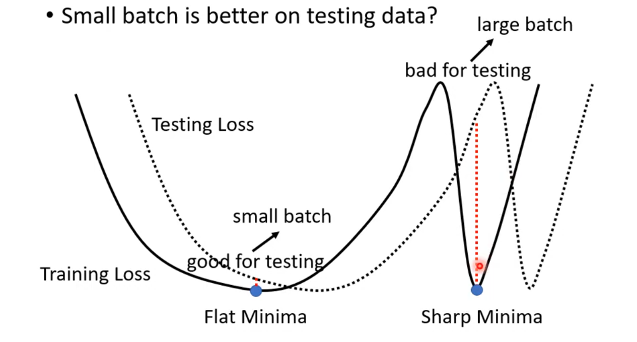 有一种解释是,训练中,small batch size 倾向于 Flat Minima,而 large batch size 倾向于 Sharp Minima,而由于测试数据和训练数据的分布存在差异,一点点的分布差异,对于 Flat Minima 来说,结果差异很小,但是对于 Sharp Minima 来说,结果差异就会很大,从而造成更大的loss。