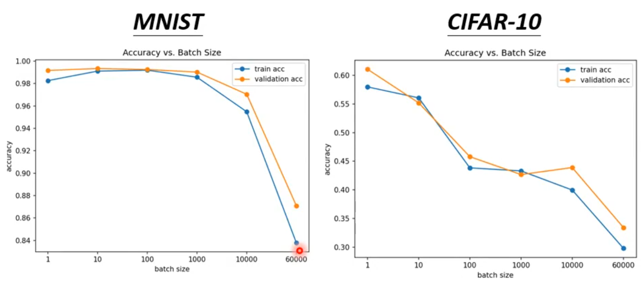 此外,即使 small batch size 和 large batch size 在训练数据上的效果相同,但是 small batch size 在测试数据上仍有优势。