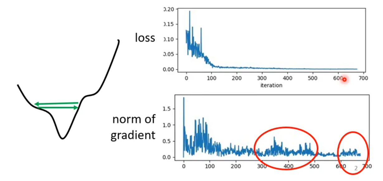 我们来看上面这张图,随着迭代的次数增加,loss趋于平缓不再下降。但是随着迭代的次数增加,梯度并不是趋于0的,而是在跳动。这说明此时训练停滞时(即loss趋于平缓),并不是因为 critical point (即梯度趋于0),而是别的原因。