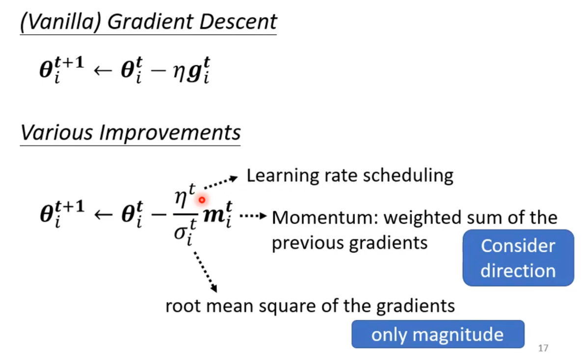我们原先使用梯度下降进行更新参数时,使用的方法是:为了简单起见,我们只看一个参数,即在第i个参数\boldsymbol \theta_i。在第t+1轮更新参数时,\boldsymbol \theta_i^{t+1} \leftarrow \boldsymbol \theta_i^t - \eta \boldsymbol g_i^t,其中\boldsymbol g_i^t = \frac{\partial L}{\partial \boldsymbol \theta_i}|_{\boldsymbol \theta = \boldsymbol \theta^t}。