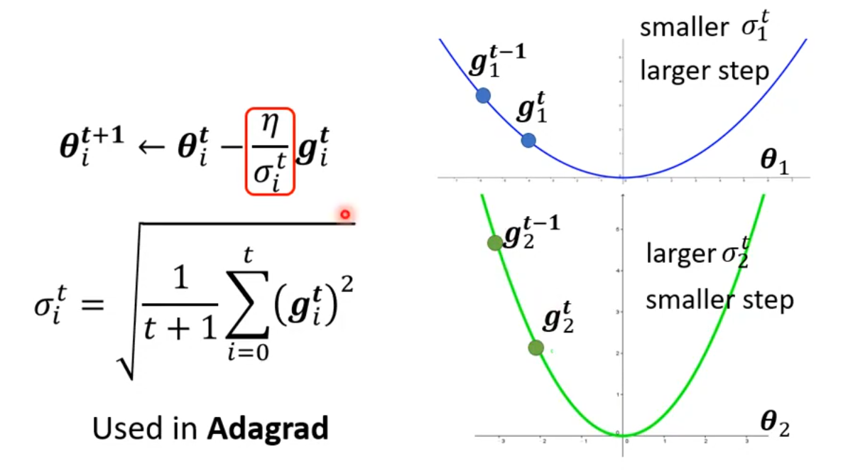 现在我们需要调整这个更新参数的过程,引入可调节的学习率\frac{\eta}{\sigma_i^t}。