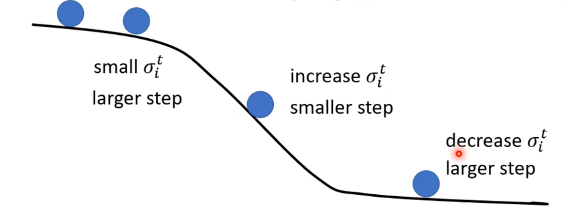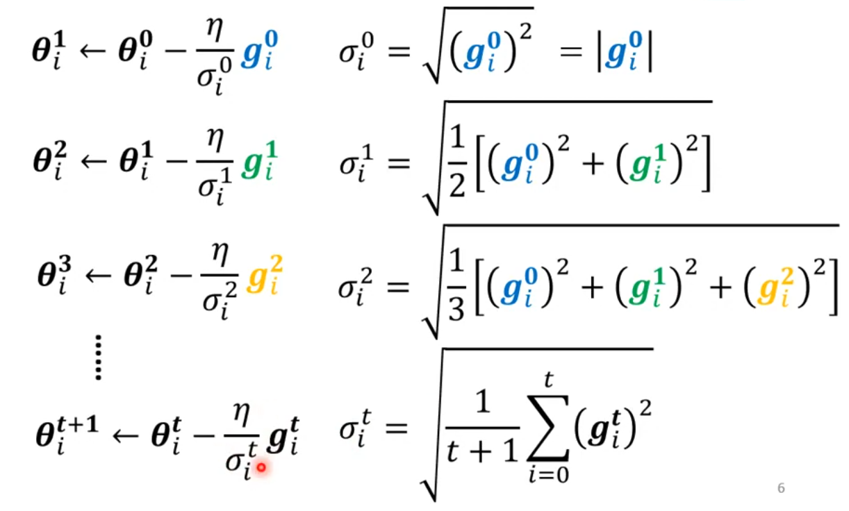 更新过程变成:\boldsymbol \theta_i^{t+1} \leftarrow \boldsymbol \theta_i^t - \frac{\eta}{\sigma_i^t} \boldsymbol g_i^t。也就是将原来的学习率\eta变成了可变化的学习率\frac{\eta}{\sigma_i^t}。其中\sigma_i^t是一个依赖于i和t的值,它是在不断变化的,接下来讲解变化的方法。