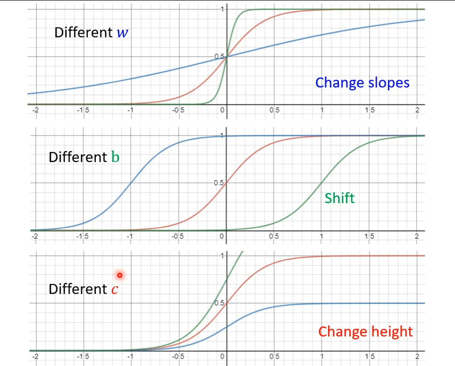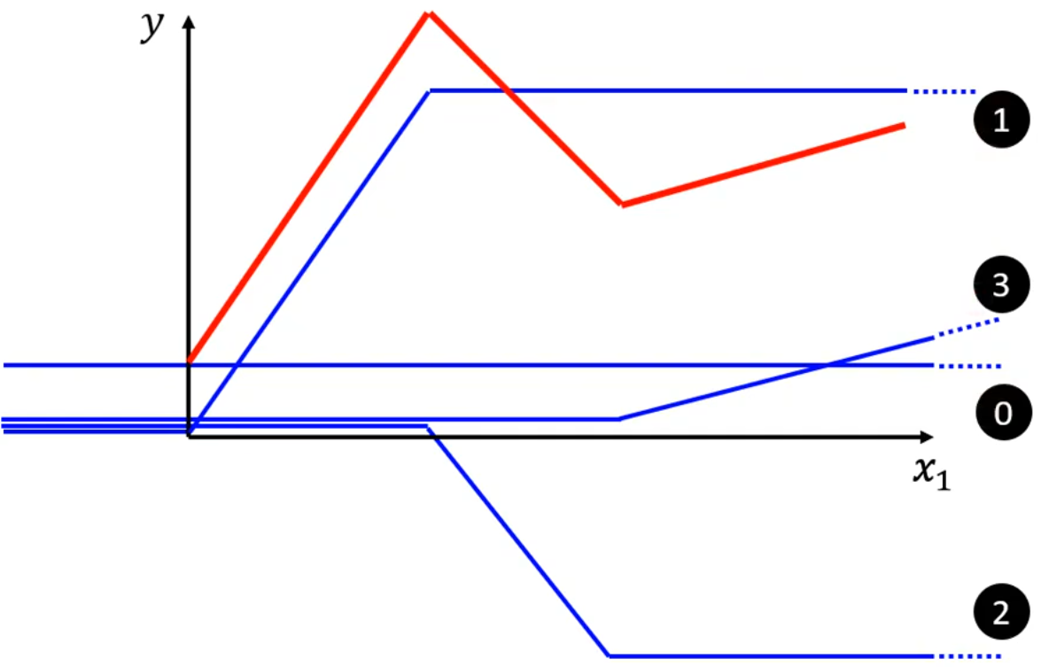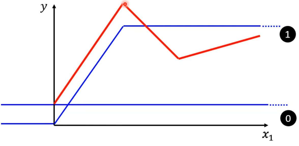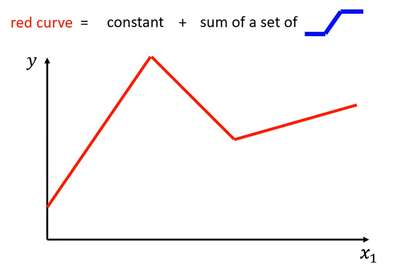 我们已经用sigmoid函数表示了“蓝线”,接下来就可以写出“红线”的函数了。红线 = 常量 + 一系列的蓝线之和。