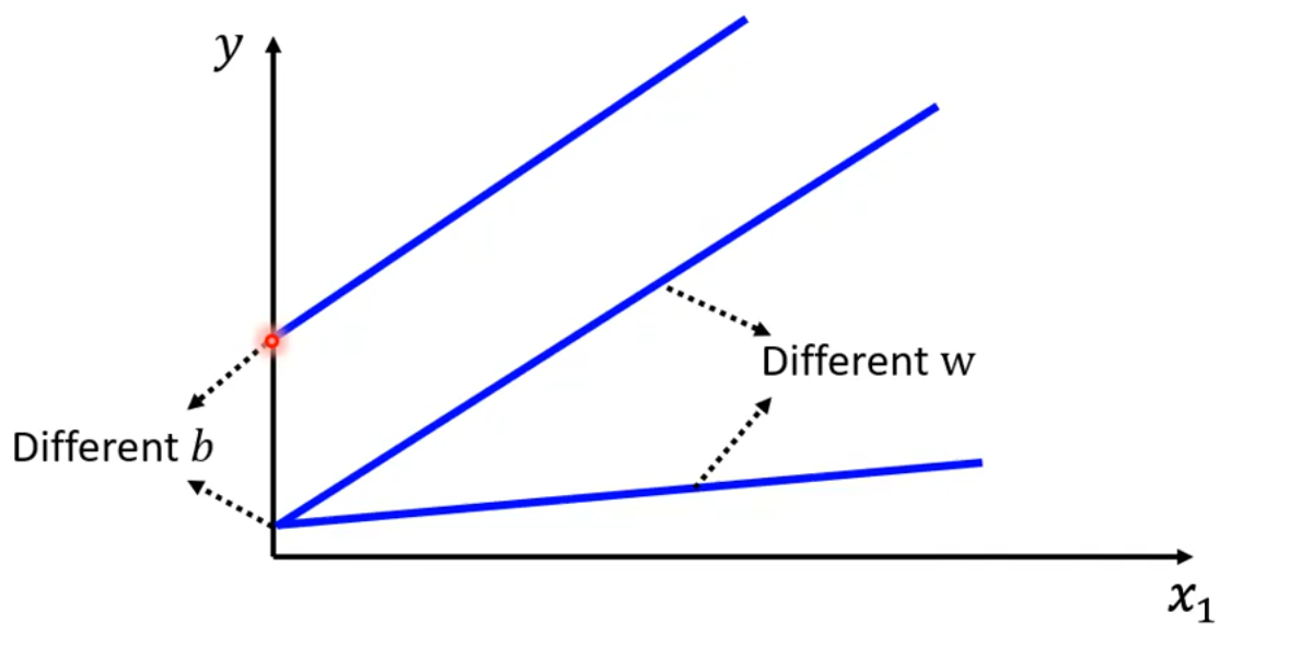 对于线性模型y = b + wx_1,模型训练的过程可以不断更新b和w,但是不论如何变化,该模型始终是一条直线: