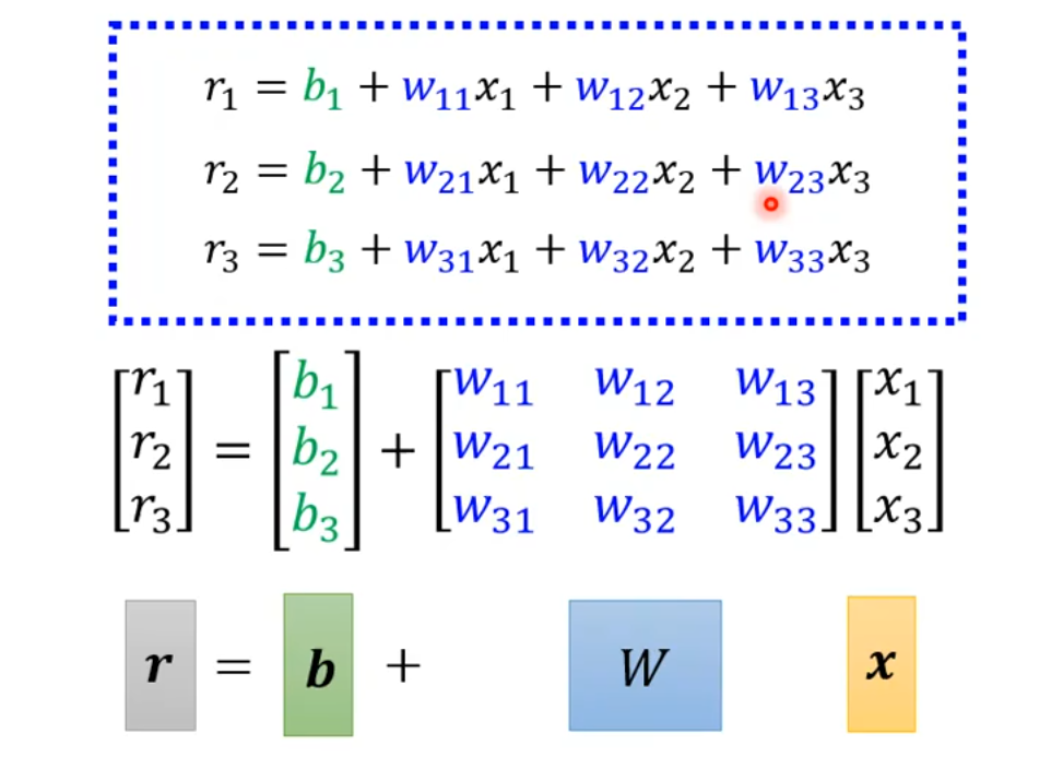 下图中,黑色圈圈1、2、3表示i的取值;黄色方块x_1, x_2, x_3表示feature,即前三天的真实数据;黑色连线表示feature要乘以权重w。对于每一个i,都要计算出一个值,记作r_i,即r_1, r_2, r_3,r_i即是sigmoid()函数的参数。