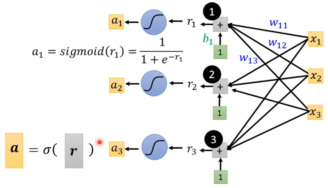 即将r_i带入sigmoid函数得到a_i。多个a_i可以写成向量\boldsymbol a,即: