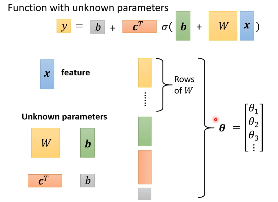 向量\boldsymbol x是feature,是已知的数据;向量\boldsymbol W, \boldsymbol b, \boldsymbol c^T和标量b是未知参数。将未知参数连接起来(就是直接从上到下一字排开),用向量\boldsymbol \theta表示,\theta_1, \theta_2, \theta_3 ...是向量\boldsymbol \theta中的一个个元素。