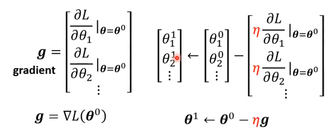 3 更新参数:\boldsymbol \theta^1 \leftarrow \boldsymbol \theta^0 - \eta\ \boldsymbol g;