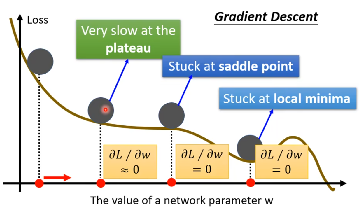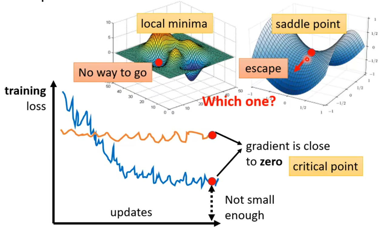 当loss还很大,但是此时梯度变得很小,训练停滞不前时,可能是遇到了非常平坦的地方,可能是local minima,也可能是saddle point。