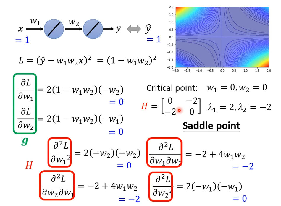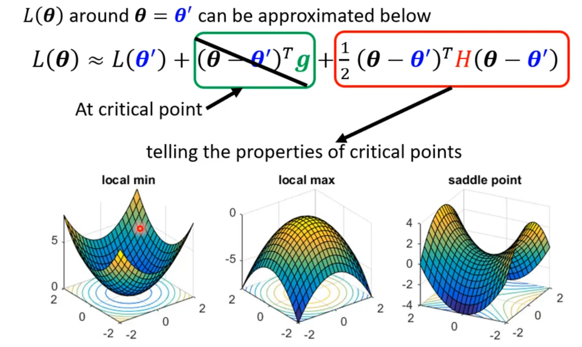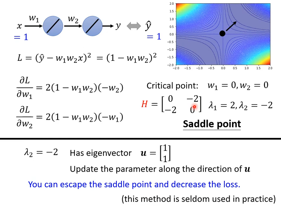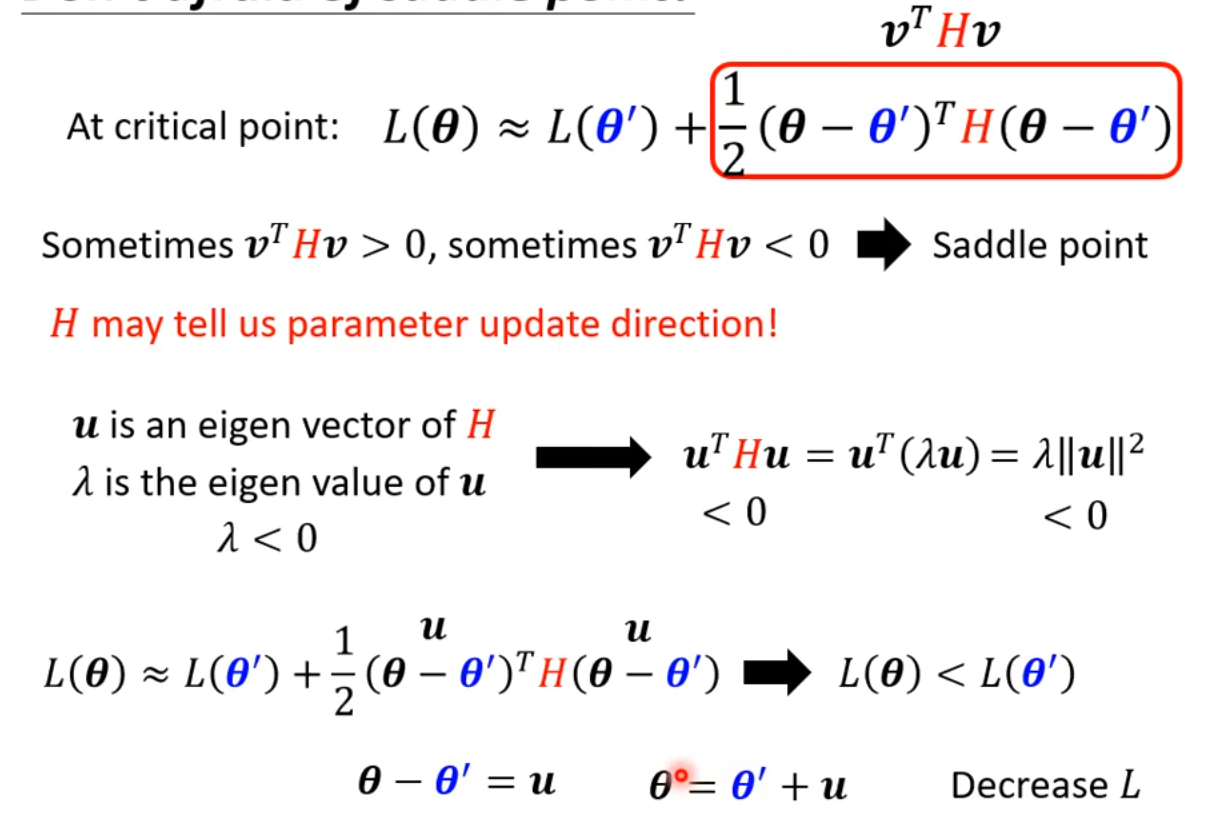 如果遇到 saddle point,我们可以通过Hessian \boldsymbol H判断模型参数更新的方向: