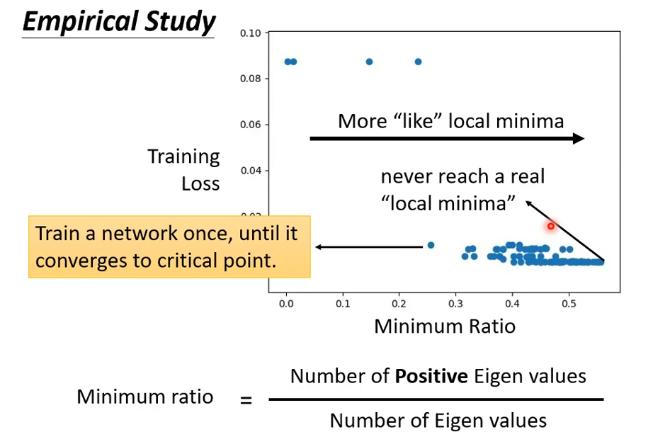 根据经验,当模型参数有很多时,遇到 local minima 的情况是非常罕见的。如果模型的loss很大并且不再下降,基本上都是卡在了 saddle point。
