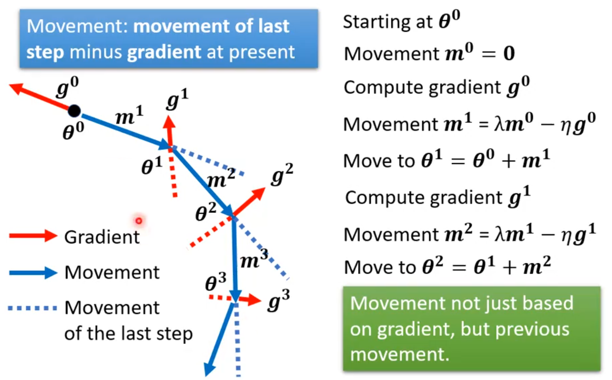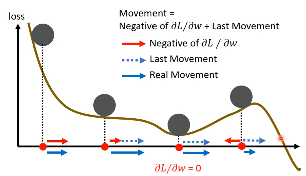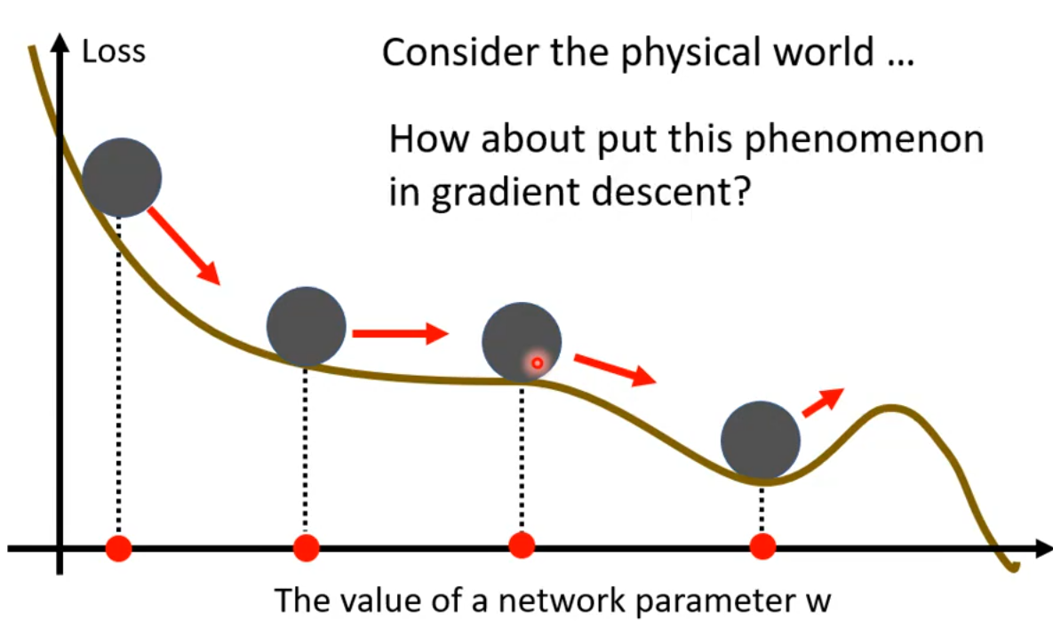 即使遇到了 local minima,也会因为引入上次的梯度而能够继续更新;