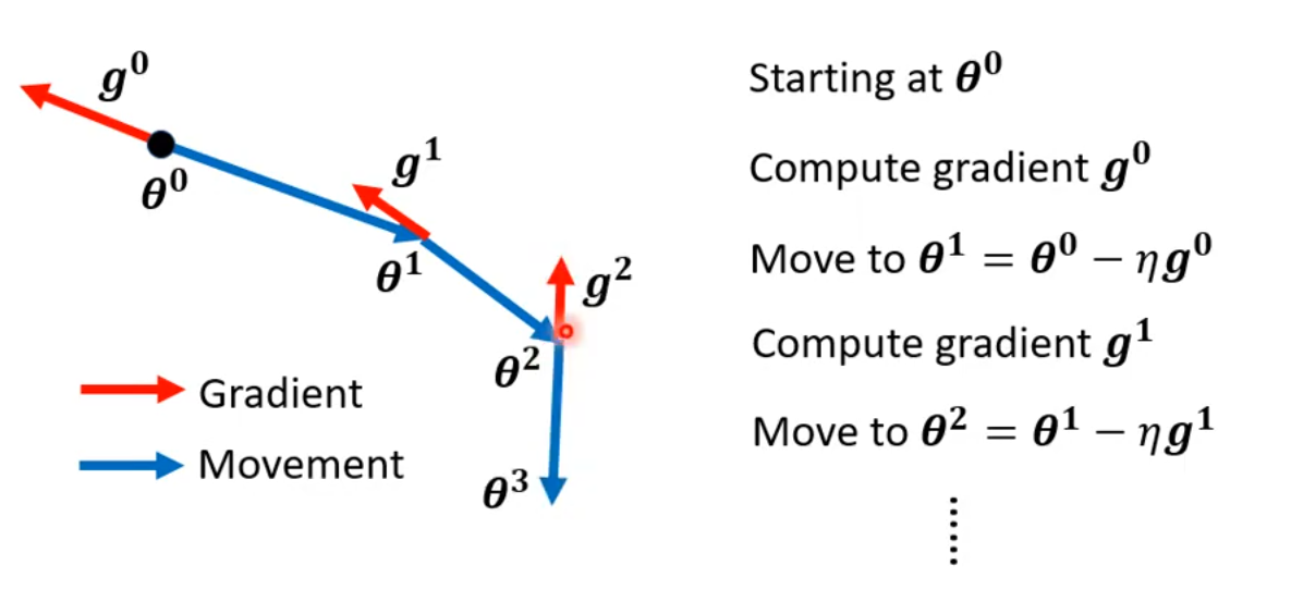 每次计算梯度后,向梯度的反方向更新参数。