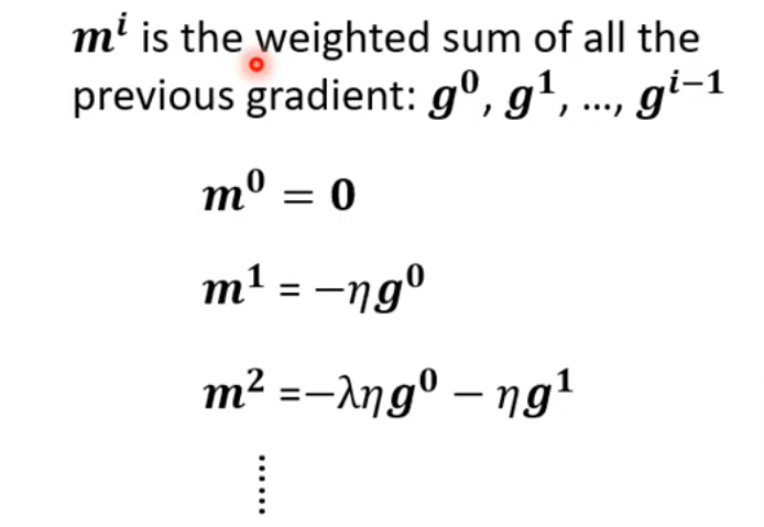 由于每次的更新方向都与上一次的方向有关,就相当于每一次的更新方向与之前每一次的方向都有关。更新方向由梯度决定,所以每次的更新方向可以用所有之前的梯度来表示: