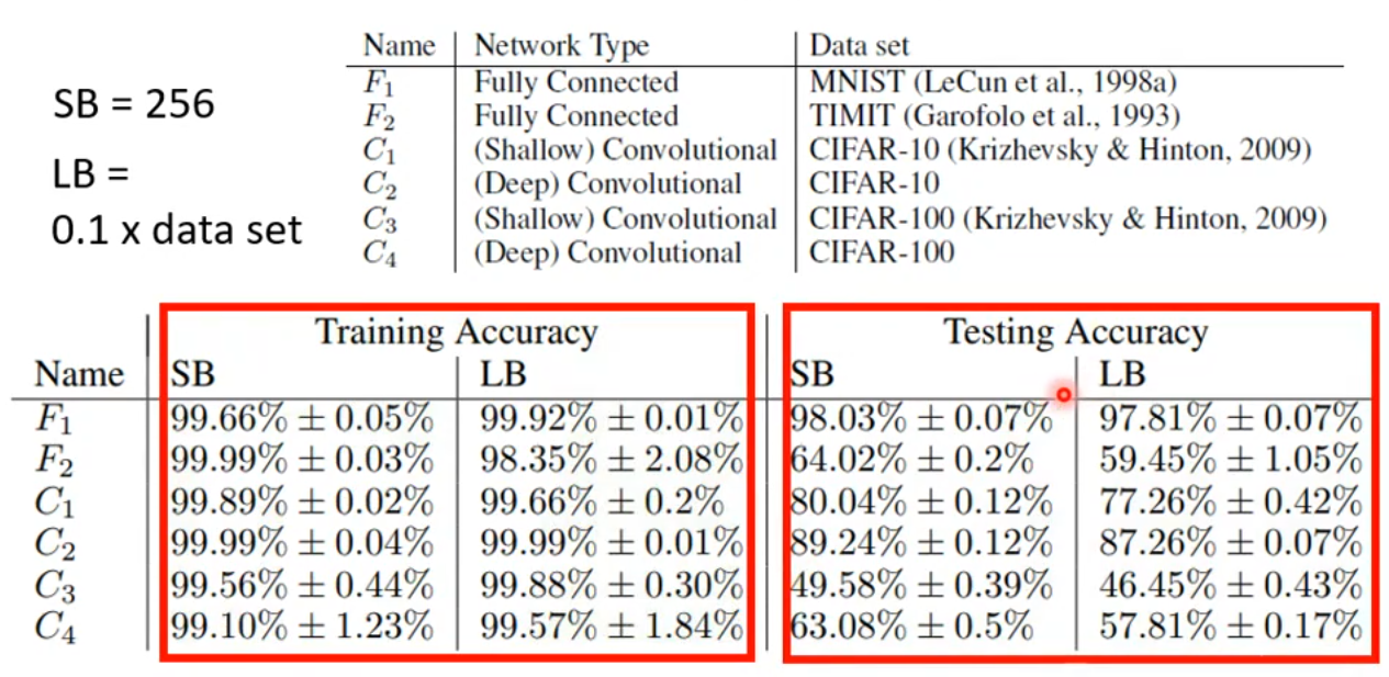 此外,即使 small batch size 和 large batch size 在训练数据上的效果相同,但是 small batch size 在测试数据上仍有优势。