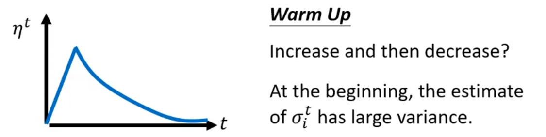 初始的时候,\sigma_i^t的方差还很大,这个时候使用较大的学习率可能会影响训练,所以可以在前期慢慢从小到大增加学习率,到某个时刻再逐渐较小。