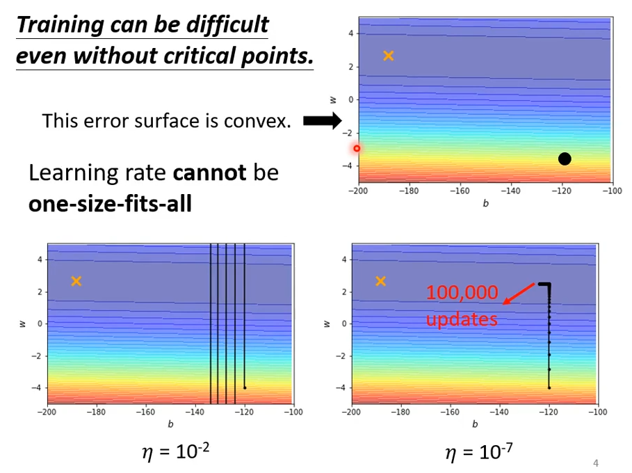 当学习率为\eta = 10^{-2}时,由于学习率太大,梯度在上下大幅度跳动,无法收敛到loss较低的地方;当学习率\eta = 10^{-7}时,由于学习率很小,成功让loss收敛得越来越小,但是在后半段灰色部分,由于曲线非常平缓,而学习率又很小,所以收敛速度非常慢,很难达到loss最小值。