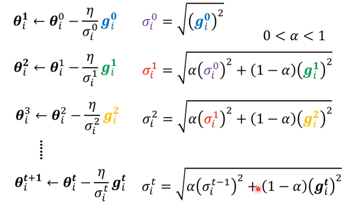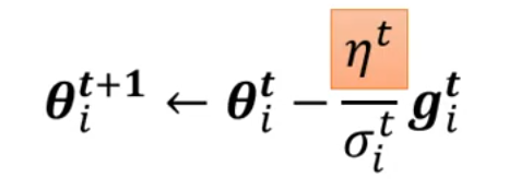 更新过程变成:\boldsymbol \theta_i^{t+1} \leftarrow \boldsymbol \theta_i^t - \frac{\eta}{\sigma_i^t} \boldsymbol g_i^t。也就是将原来的学习率\eta变成了可变化的学习率\frac{\eta}{\sigma_i^t}。其中\sigma_i^t是一个依赖于i和t的值,它是在不断变化的,接下来讲解变化的方法。