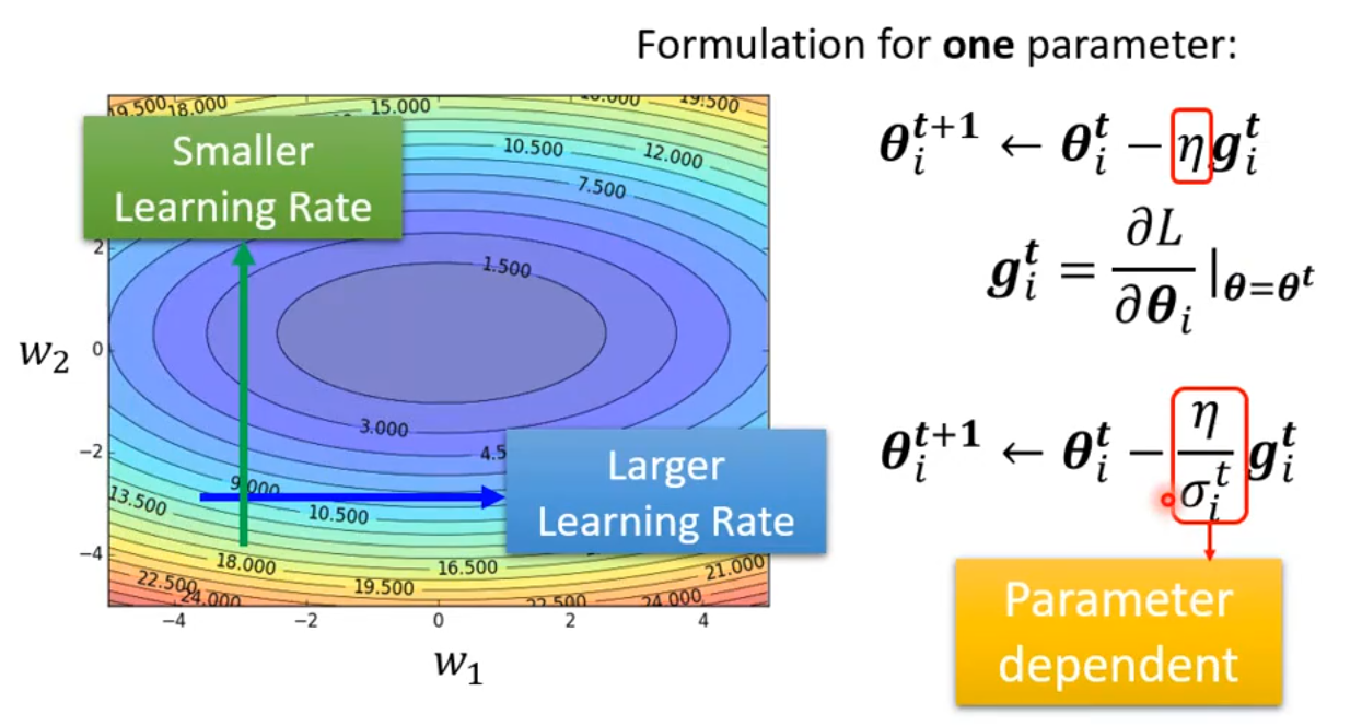 现在我们需要调整这个更新参数的过程,引入可调节的学习率\frac{\eta}{\sigma_i^t}。