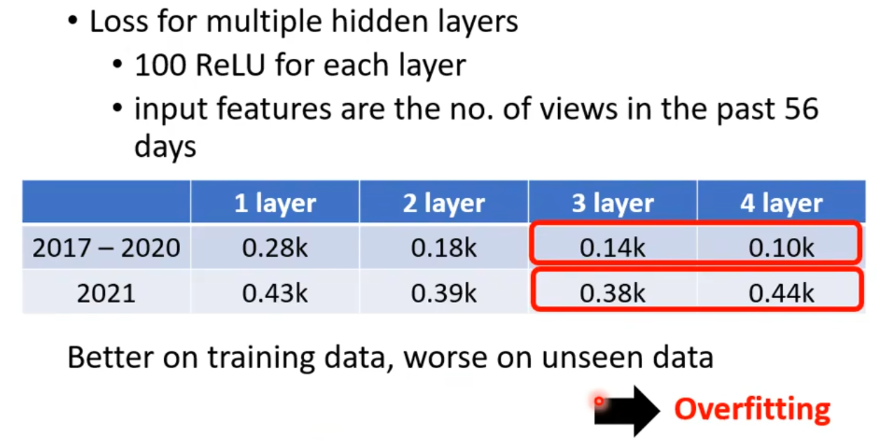 我们来继续加深层数,4层的模型相比于3层的模型,虽然对于训练数据上loss更小,但是在测试数据上的loss更大。这意味着4层网络的预测效果反而更差。这种现象成为过拟合(Overfitting)。很显然,我们应该选择3层的模型,并不是越deep越好。