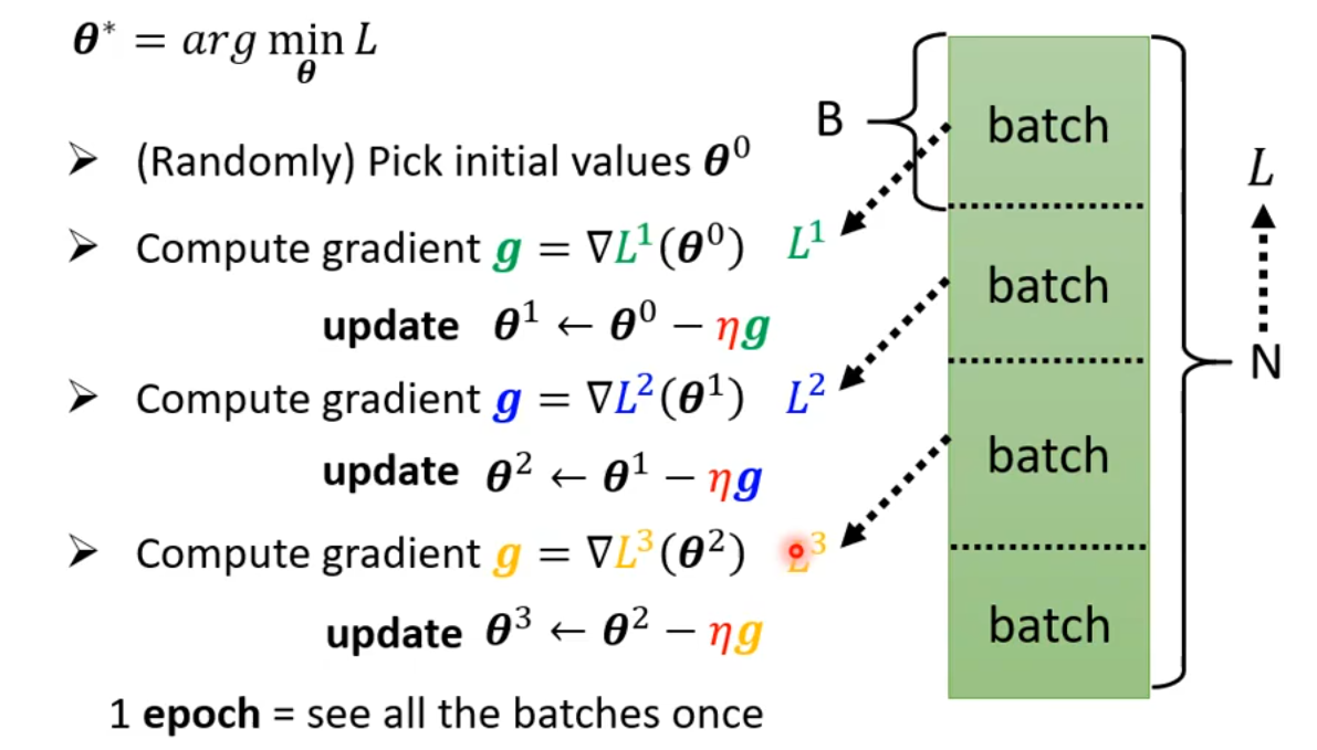 使用第1个batch的数据计算第1个梯度g = \bigtriangledown L(\boldsymbol \theta^1),并更新参数\boldsymbol \theta^1 \leftarrow \boldsymbol \theta^0 - \eta\ \boldsymbol g;
