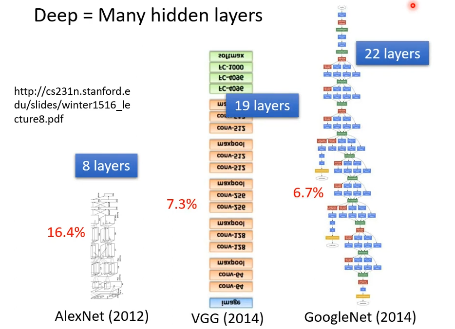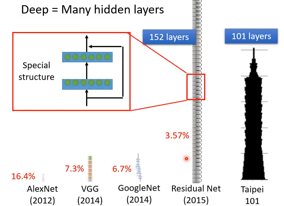 我们来看看近些年来的深度学习网络,图中的红色百分数指的是错误率: