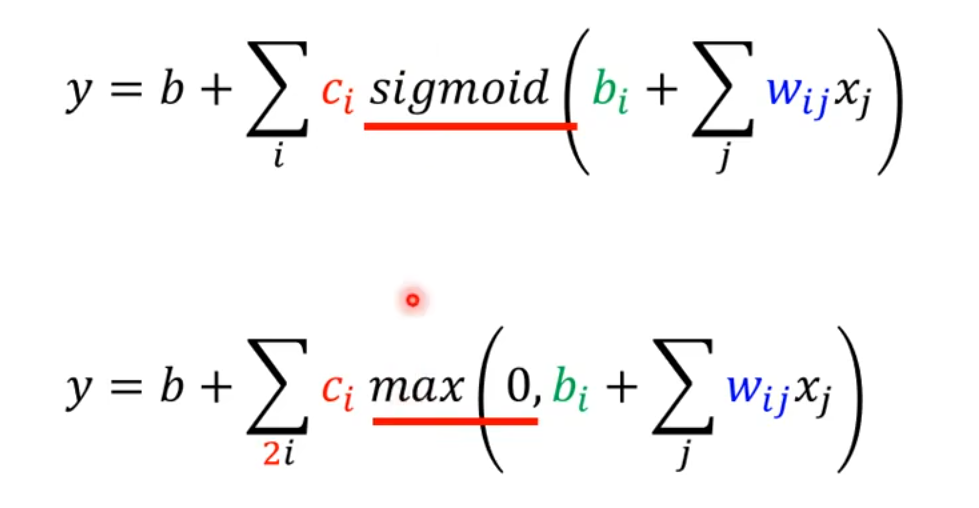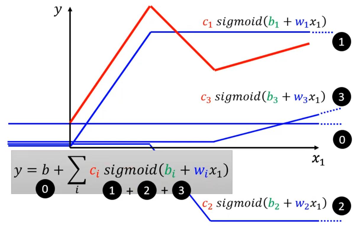 我们已经用sigmoid函数表示了“蓝线”,接下来就可以写出“红线”的函数了。红线 = 常量 + 一系列的蓝线之和。