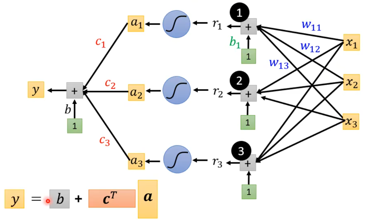 上图中的表达式y = b + \boldsymbol {c^T} \boldsymbol a,其中\boldsymbol c是\begin{bmatrix} c_1 \\ c_2 \\ c_3 \end{bmatrix} ,\boldsymbol {c^T}是\boldsymbol c的转置,即\begin{bmatrix} c_1 & c_2 & c_3 \end{bmatrix}。最终我们得到模型完整的函数为: