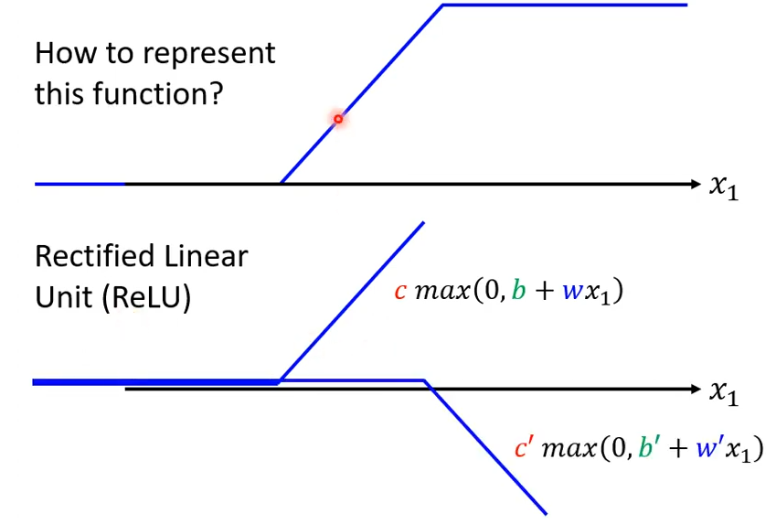 如何表示 Hard Sigmoid 的曲线呢?我们可以使用两个 Rectified Linear Unit(ReLU)的函数之和来表示 Hard Sigmoid。ReLU是一个两段曲线,前一部分与x轴重合,,后一部分是射线。其表达式为:c \space max(0, b+wx_1)。