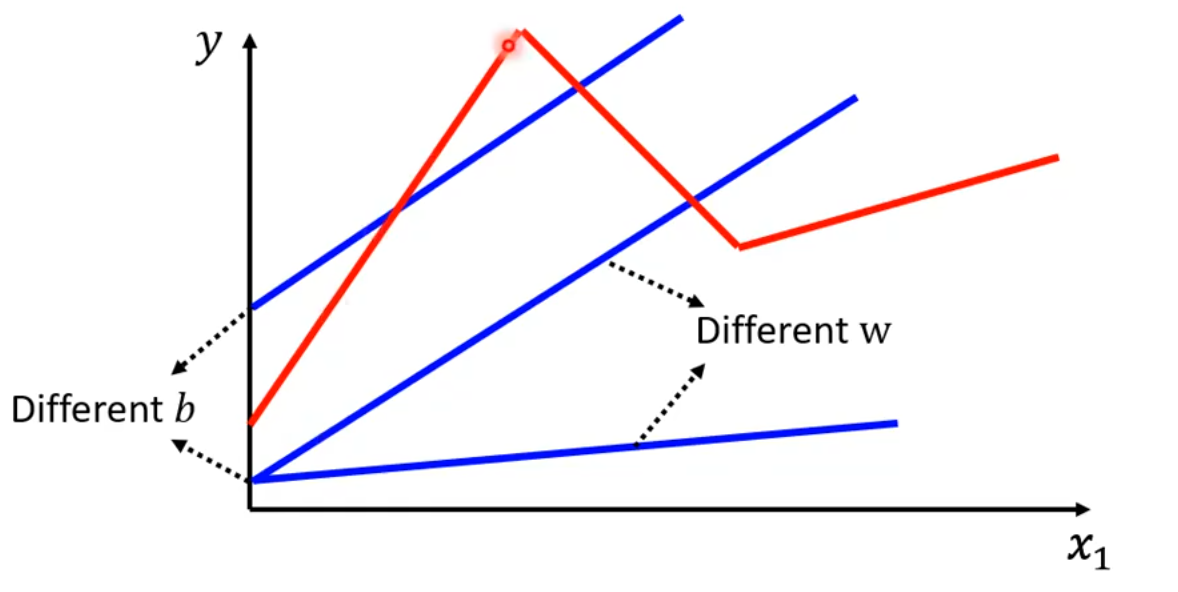 对于线性模型y = b + wx_1,模型训练的过程可以不断更新b和w,但是不论如何变化,该模型始终是一条直线:
