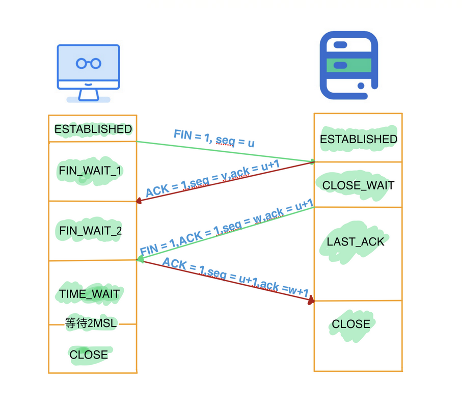 由于TCP连接是全双工的(即数据可以双向独立传输),因此每个方向都必须单独进行关闭。这个过程的目标是优雅地关闭连接,确保双方的数据都已完成传输。